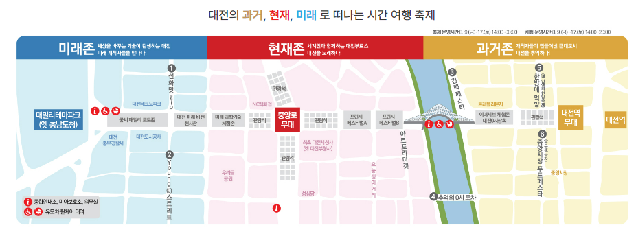 대전 0시 축제는 과거, 현재, 미래로 나눠서 행사를 진행하여 모든 연령대가 함께 즐길 수 있도록 하였습니다.
